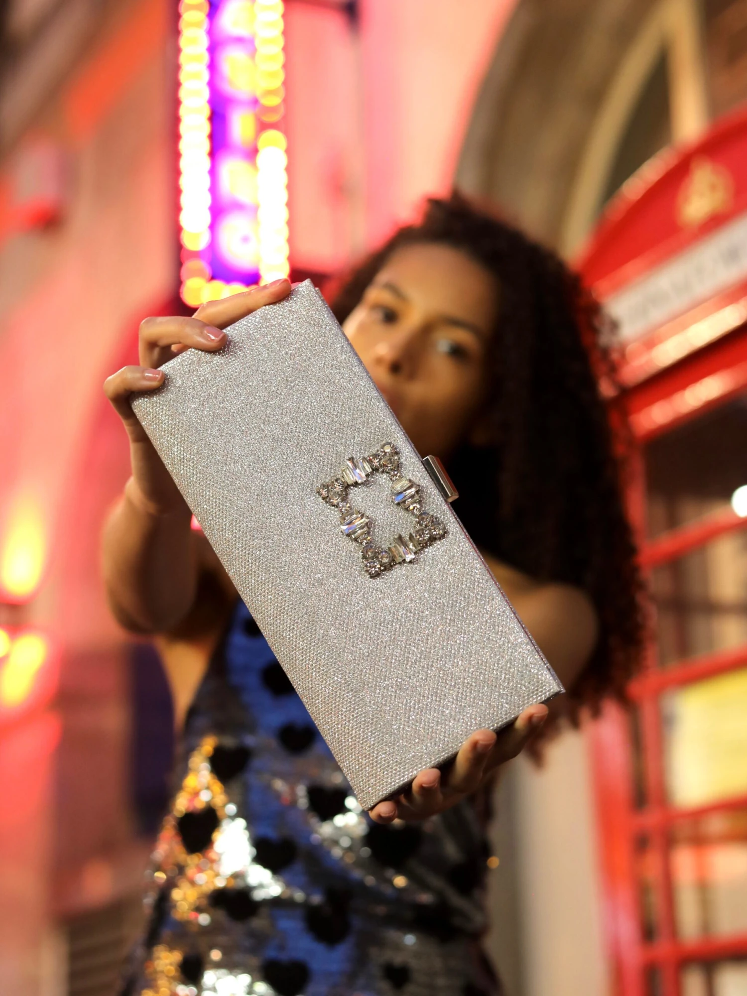 Introducing our Admire silver glitter clip clutch bag – a captivating fusion of sophistication and opulence. Embellished with a striking large diamante trim, this clutch exudes a touch of radiance, enhancing your overall look. Complete with a convenient shoulder chain for added versatility and an interior pouch to keep your essentials well-organised, this clutch is the ideal companion for your upcoming special event.