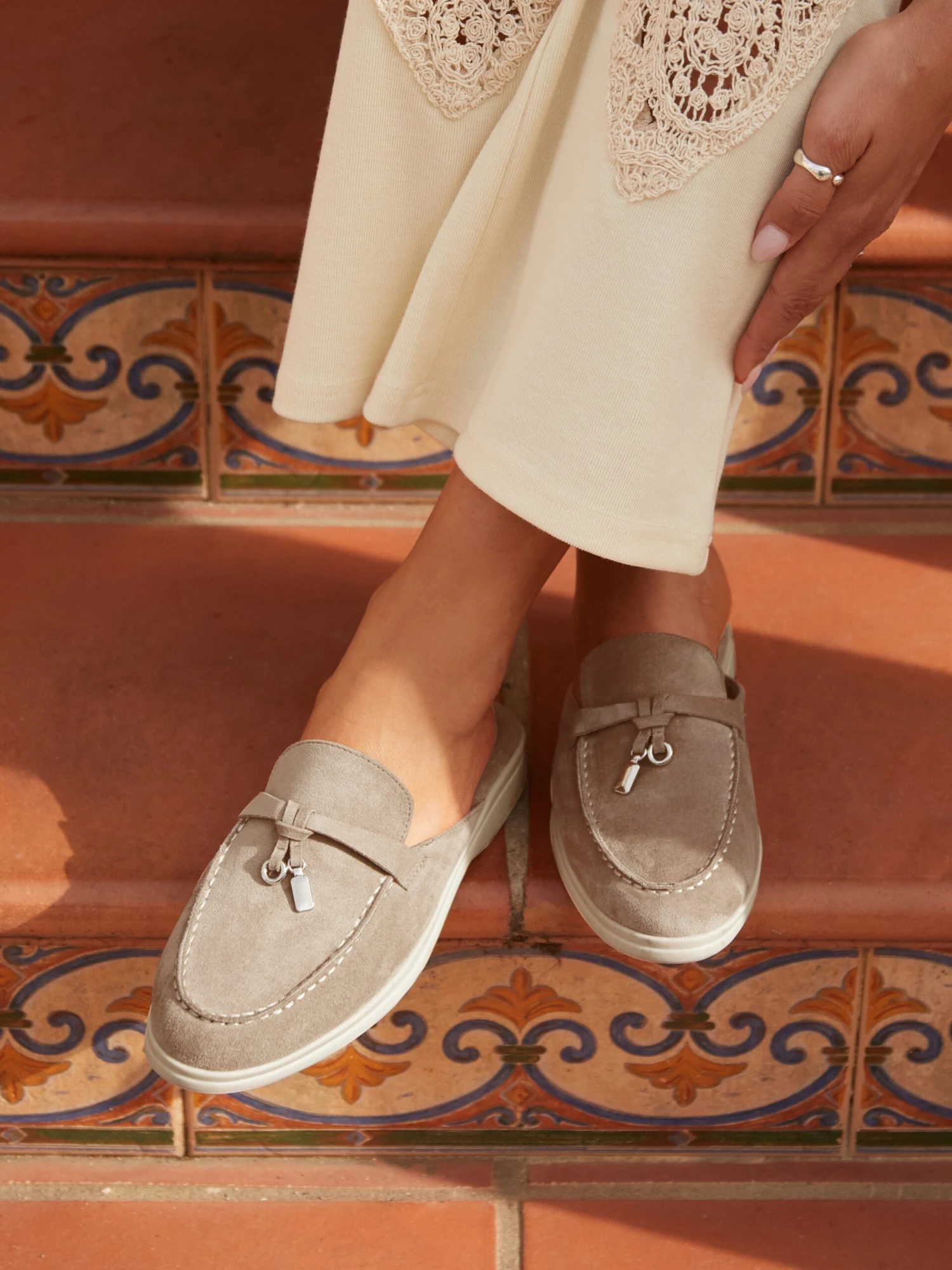 Expertly crafted with soft faux suede, these Summer mule style loafers feature elegant gold trim detailing. Versatile for any occasion, they can be dressed up with a smart linen trouser for a sophisticated evening look or dressed down with a Summer dress for a casual daytime outfit. Enjoy all-day comfort with our padded insock.