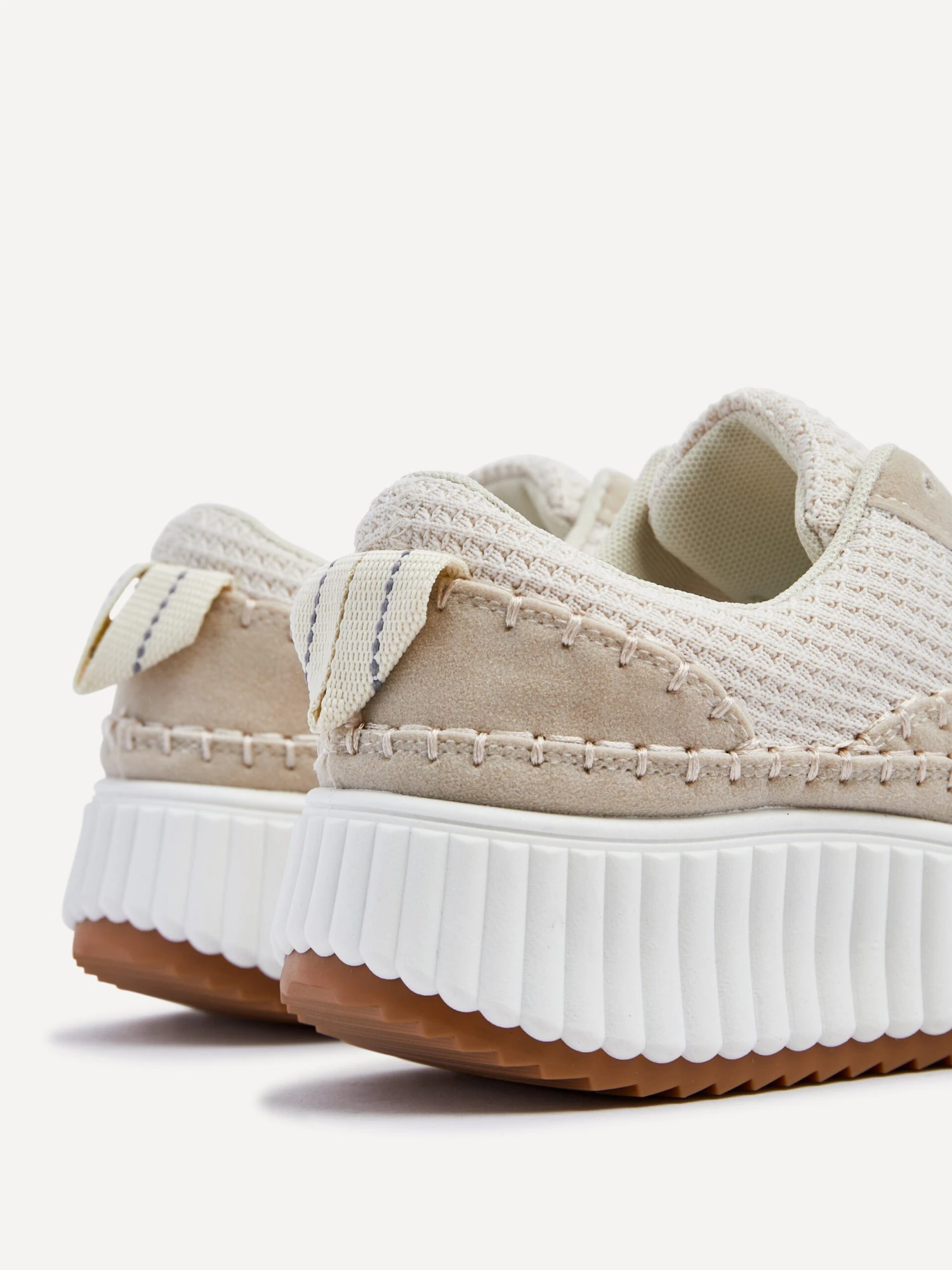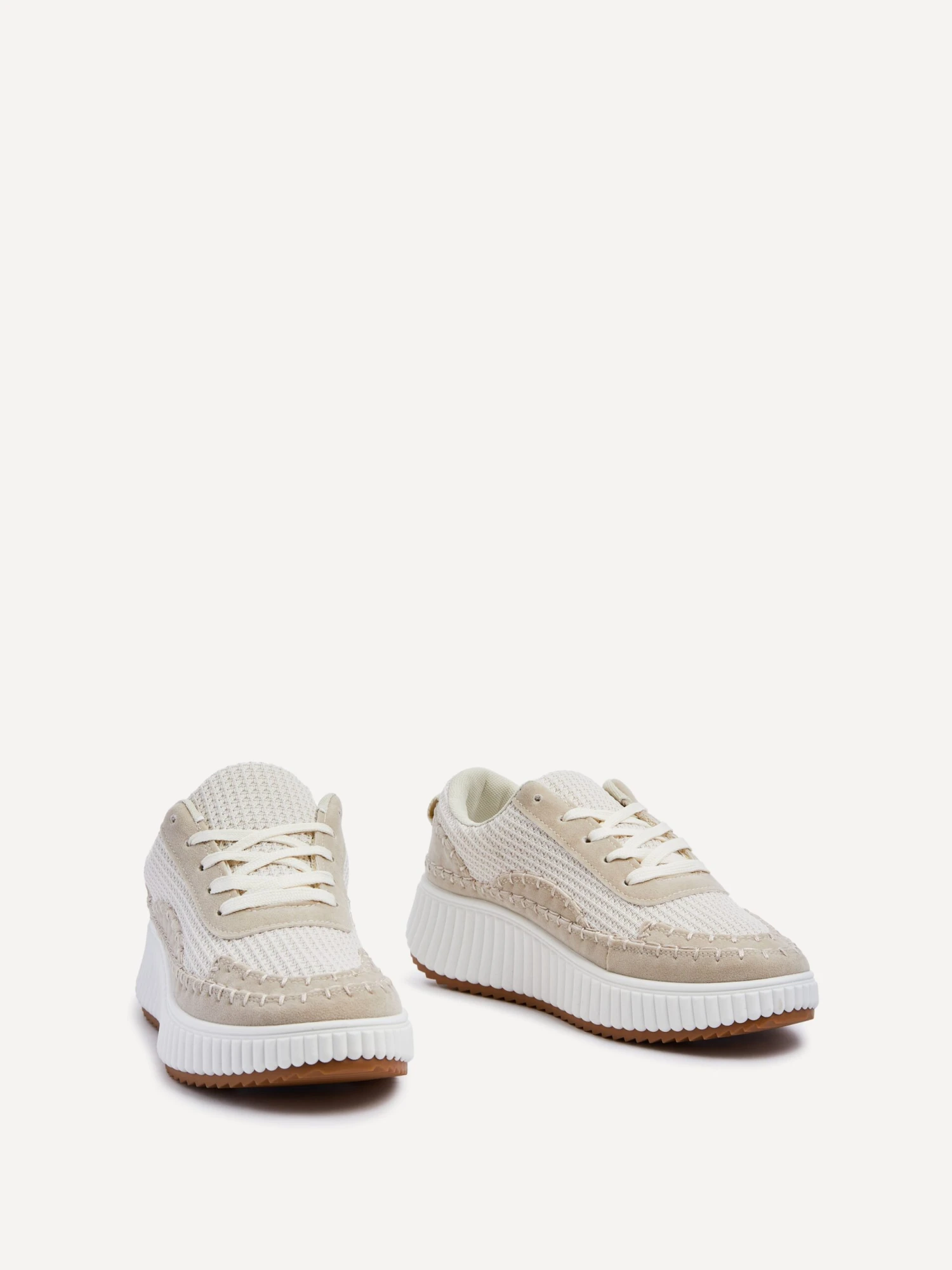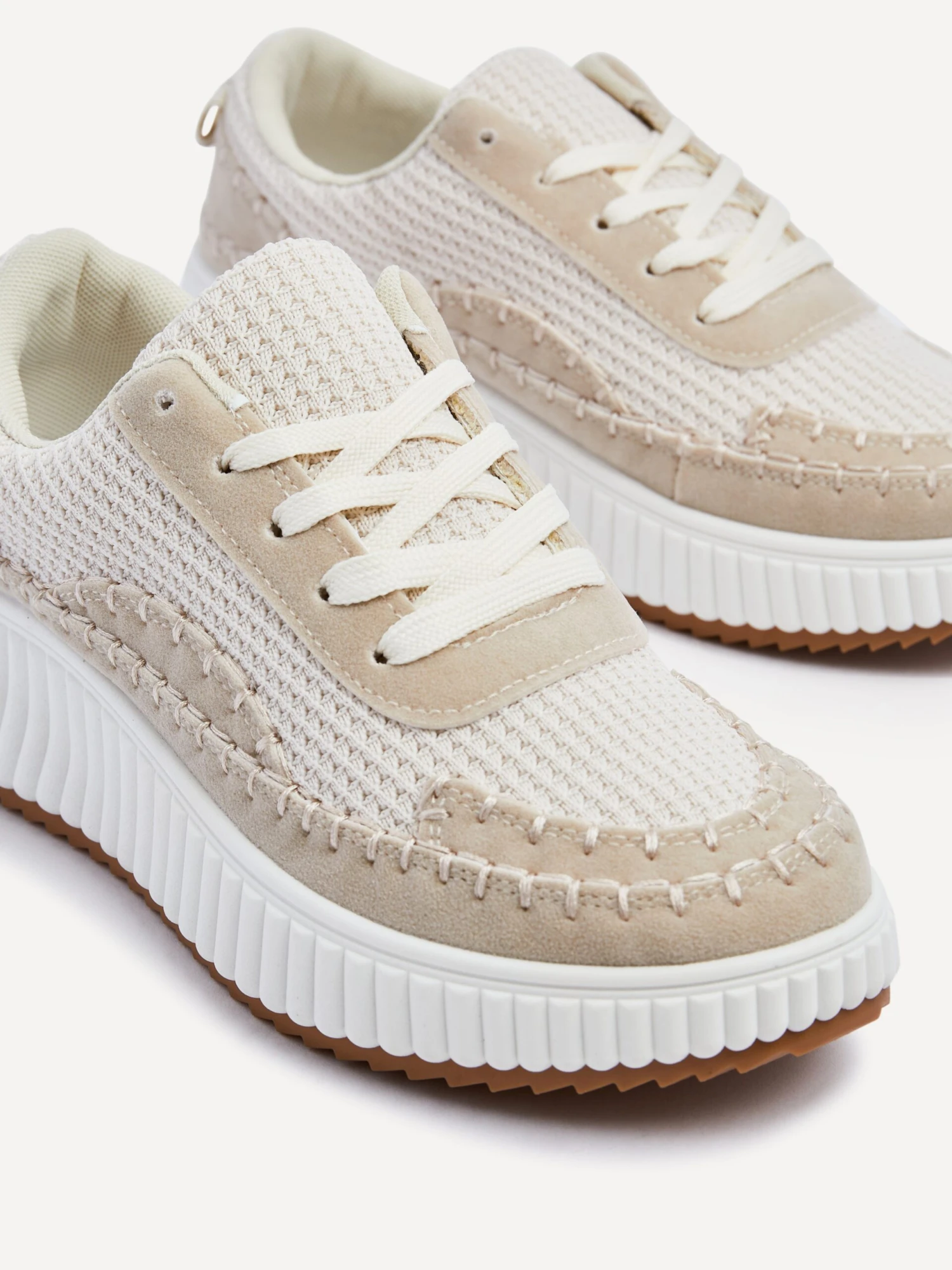 Indulge in luxury with our sophisticated neutral knitted chunky trainer featuring exquisite stitching detail. Elevate your style with the addition of a chunky cleated white sole, adding a touch of elegance to your footwear.
