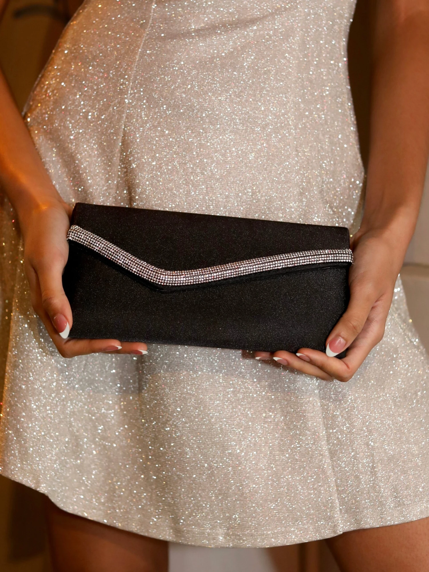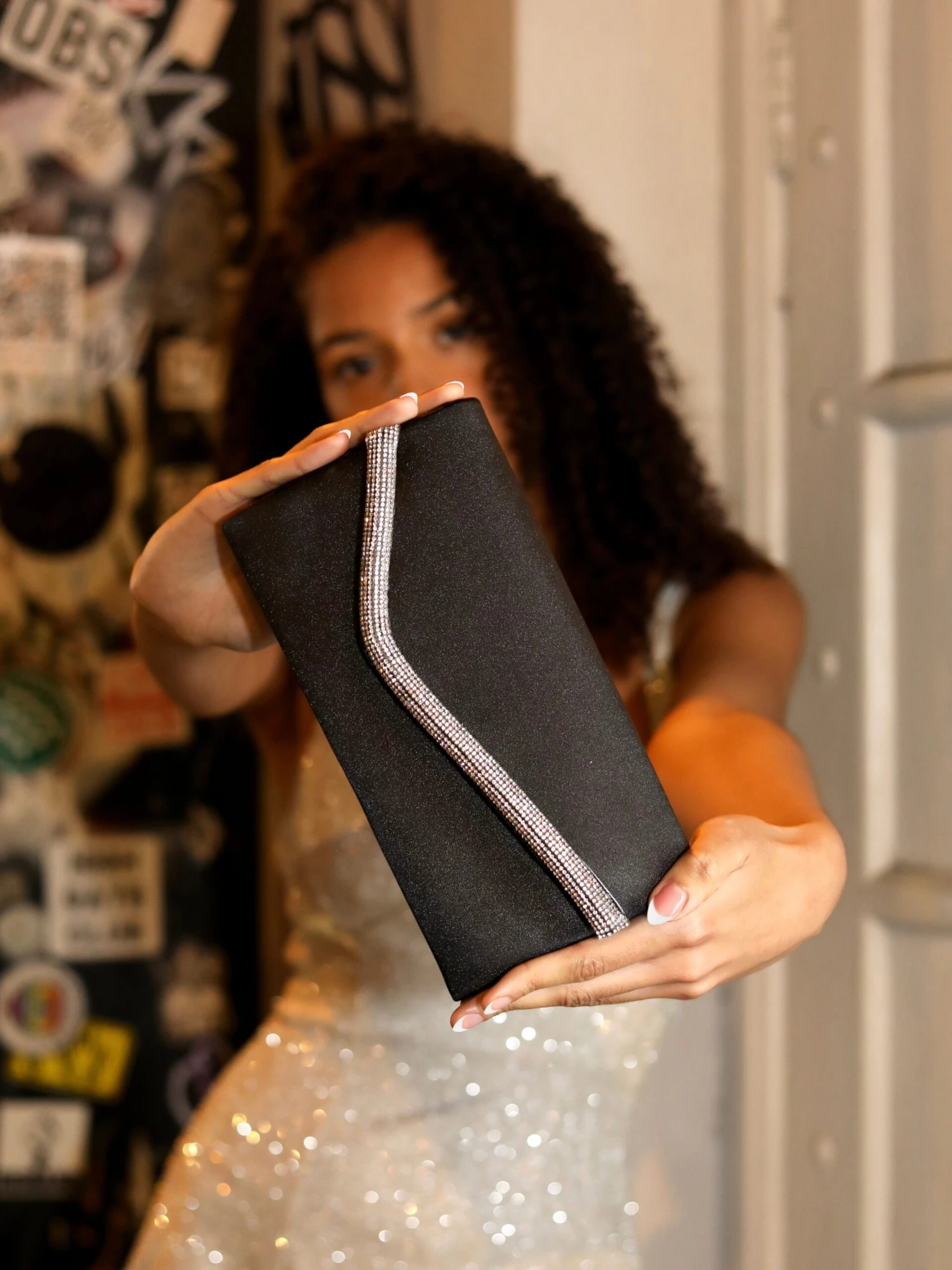 Step into the spotlight with our black Aveline envelope clutch bag, where timeless sophistication meets a touch of dazzling allure. A unique diamante tubing trim sets this clutch apart, making it the ideal companion for your next special occasion. The detachable shoulder chain adds a dash of versatility, and inside, you’ll discover a pouch for effortless organisation. Make a statement that’s as distinctive as you are with this exceptional clutch.