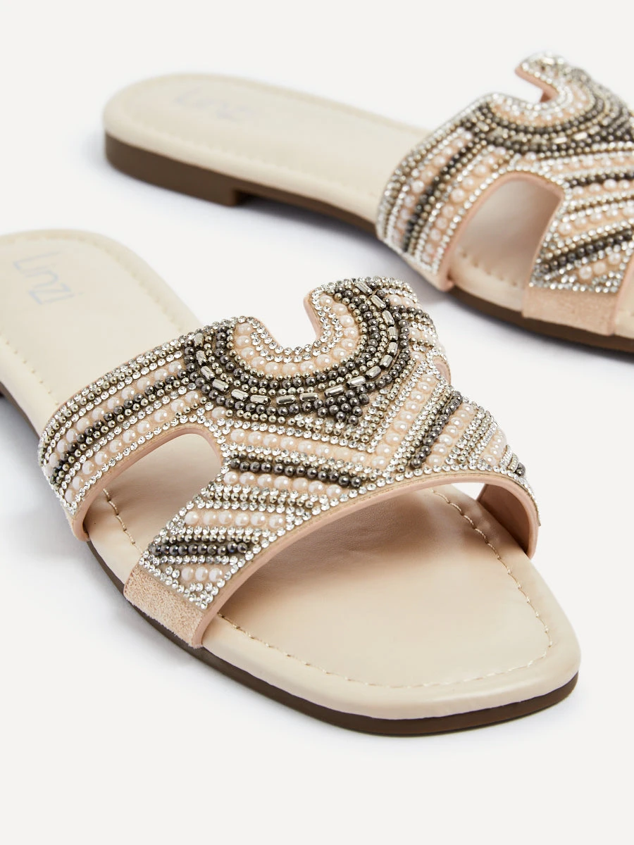 Luxurious faux leather flat slider sandal adorned with an exquisite Aztec design diamante embellishment on the front strap. Ideal for the Summer season and your next holiday, with a padded insole for ultimate comfort.