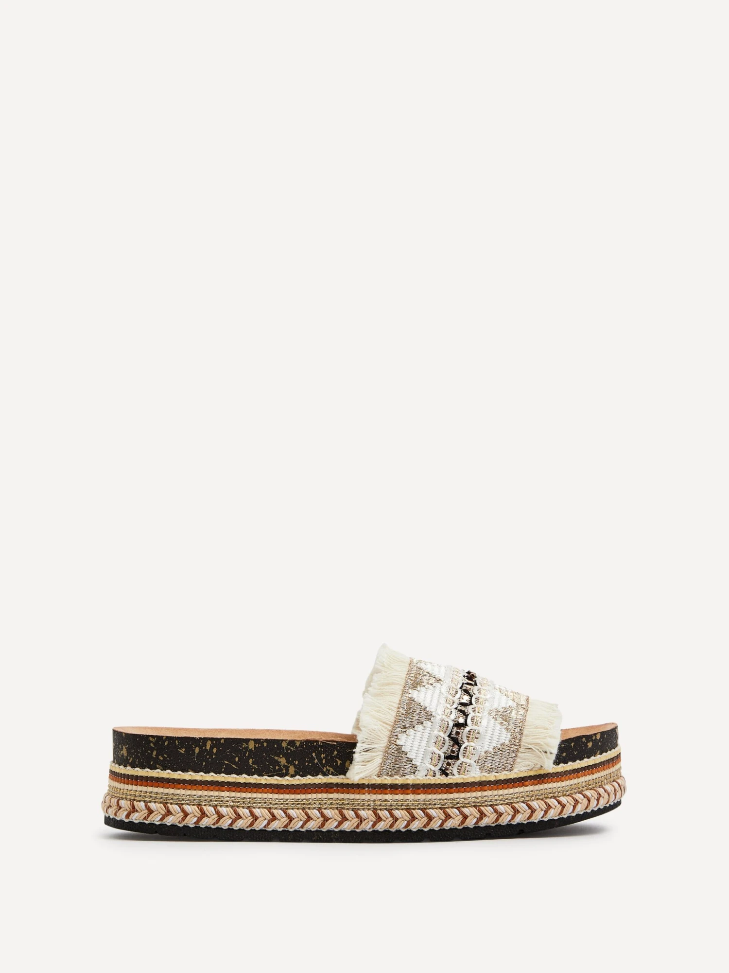 Introducing Janelle – a luxurious flatform slider sandal featuring a frayed, aztec stitched front strap and plaited rand detailing, with a 4.5cm flatform height. Elevate your style with this sophisticated and exclusive addition to your wardrobe.