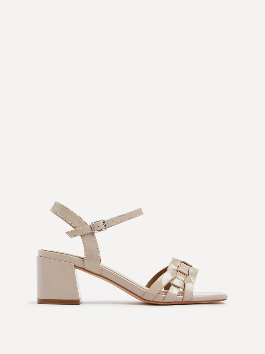 Featuring a unique plaited detail front strap and low 5.5cm block heel, our Jhene Nude Patent heeled sandals exude timeless charm and a touch of subtle glamour to any ensemble.