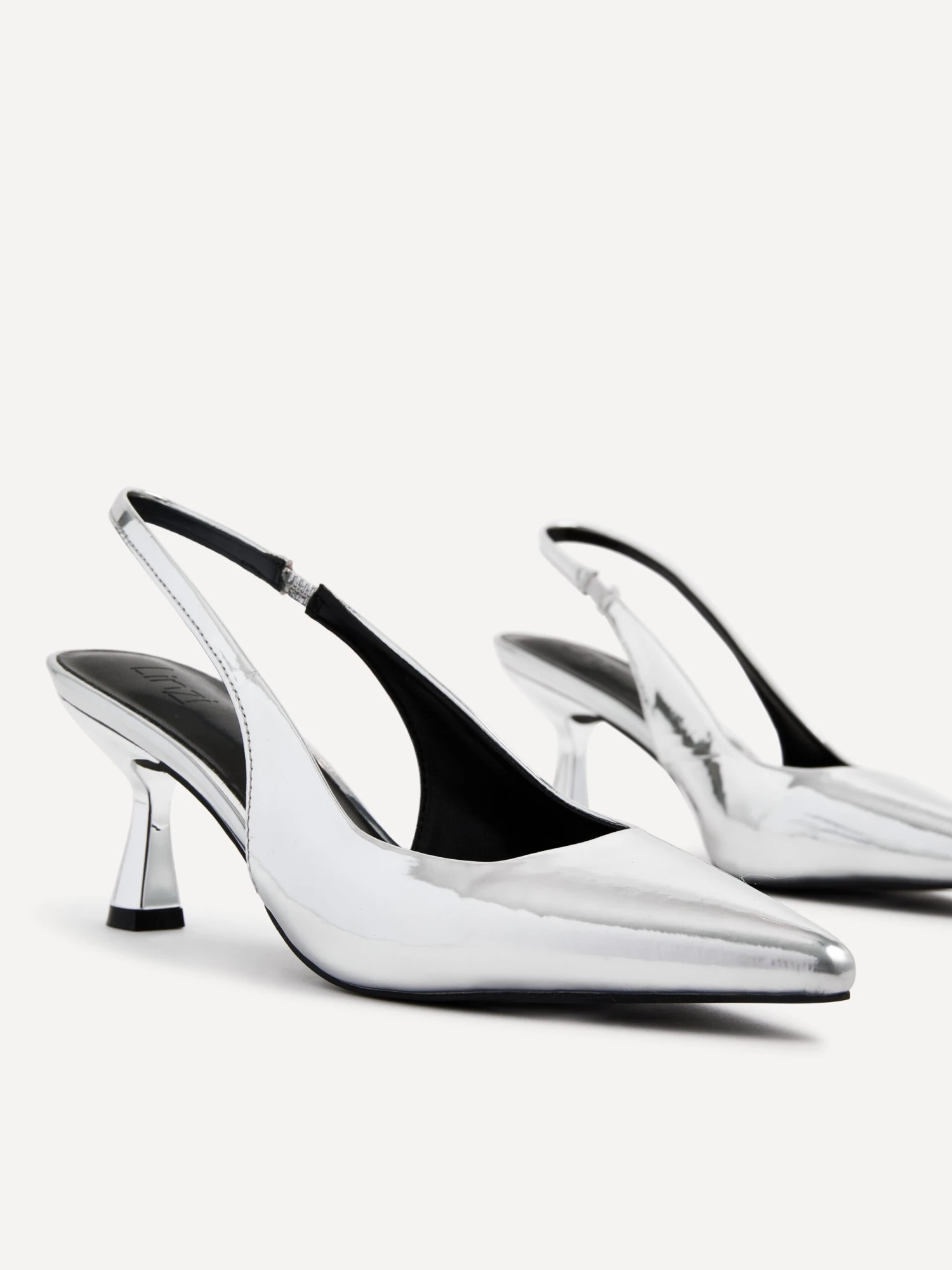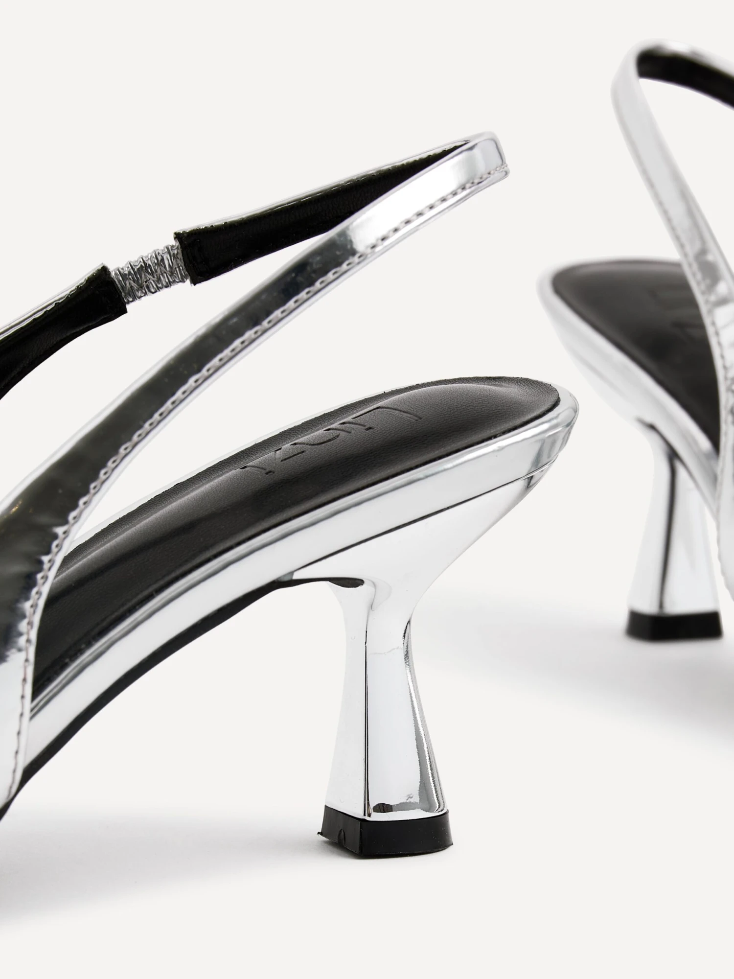 Elevate your look with our 6.5cm chrome stiletto court shoes. The sleek chrome finish and slingback design add a touch of elegance to any outfit. Step with confidence in our luxurious heels.
