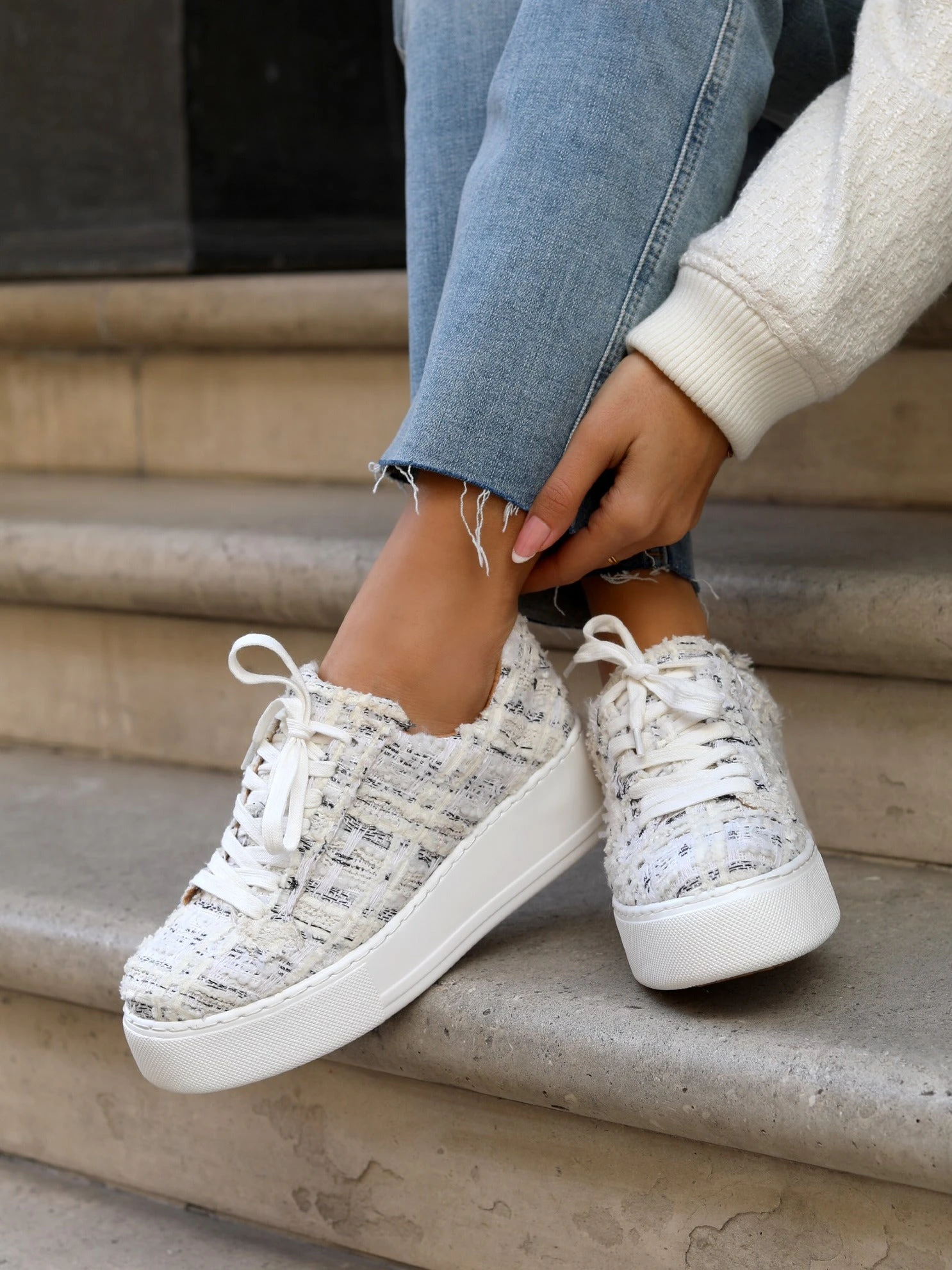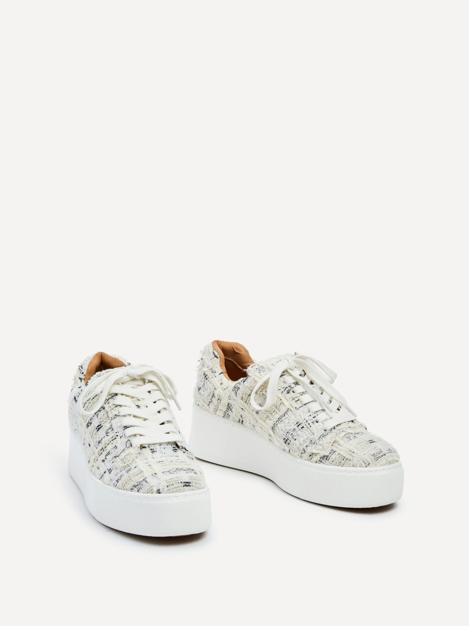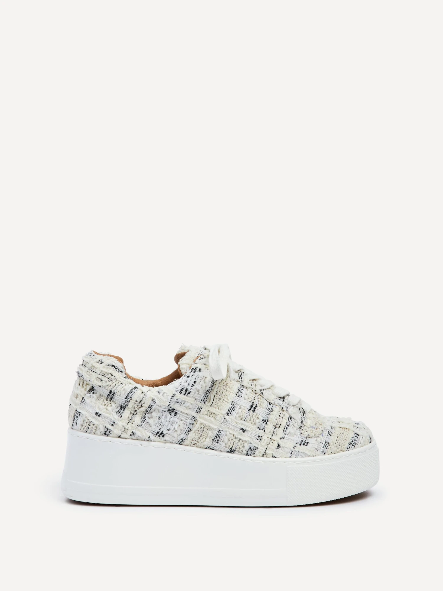 A luxuriously tweed-woven upper encloses the feet in this lace-up trainer, designed with fashion-forward sensibilities in mind. An elegant nude insock and snow-white platform sole make for a look which is both sophisticated and comfortable, with a platform height of 5.5cm.