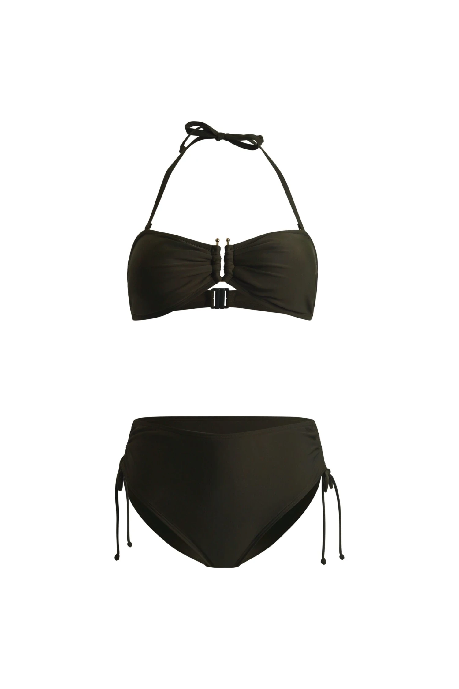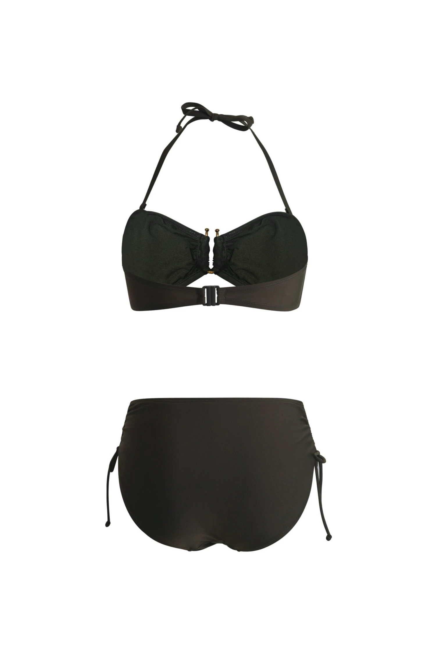 Our Sienna bikini is the essential stylish swim set you need this season. A soft cup bandeau bikini top with gold trim detail and detachable, adjustable straps. Matched with a deep high waist bottom with adjustable ties.