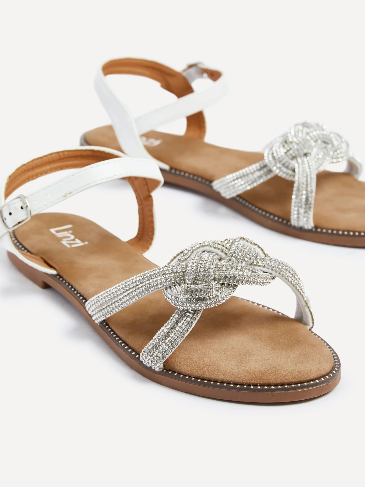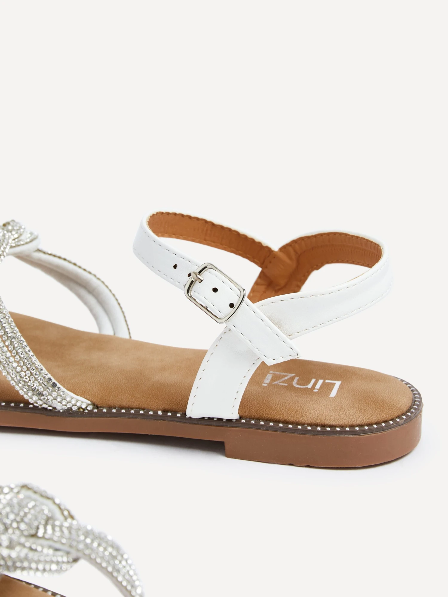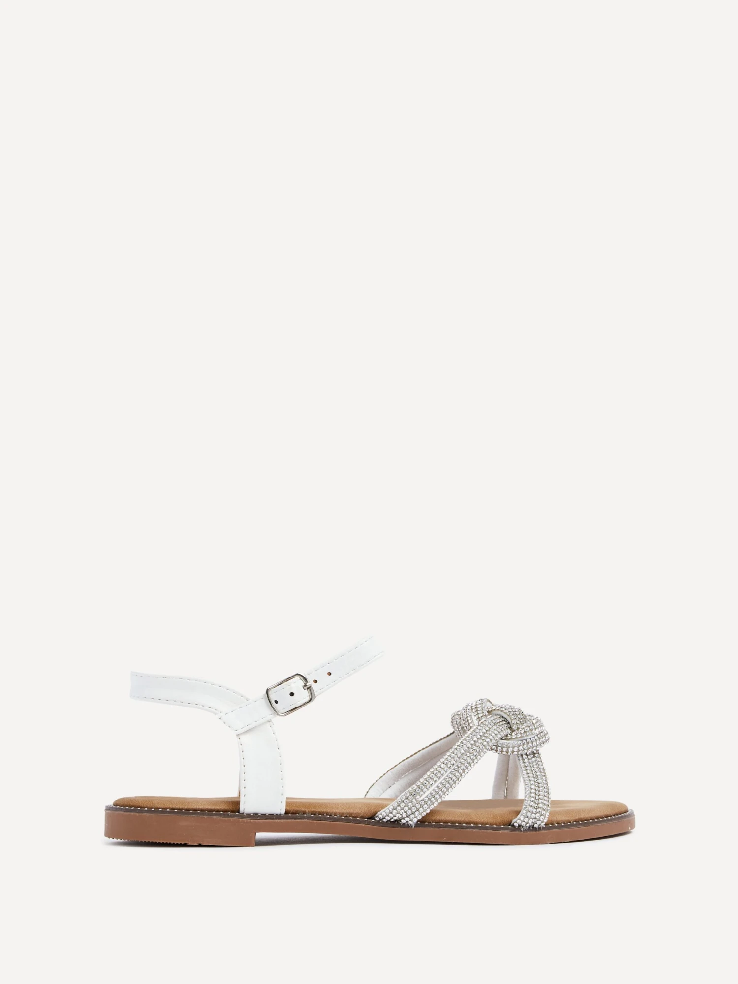 Elevate your style with our luxurious Soft Faux Leather Two Part Sandal. The elegant Diamante Knotted Design on the front strap adds a sophisticated touch, while the padded instock provides comfort and support.Â