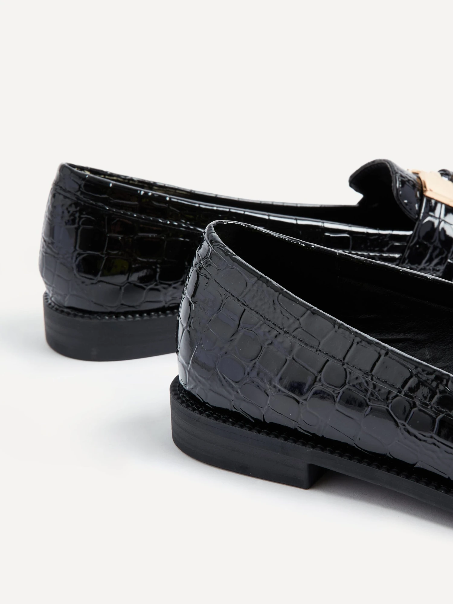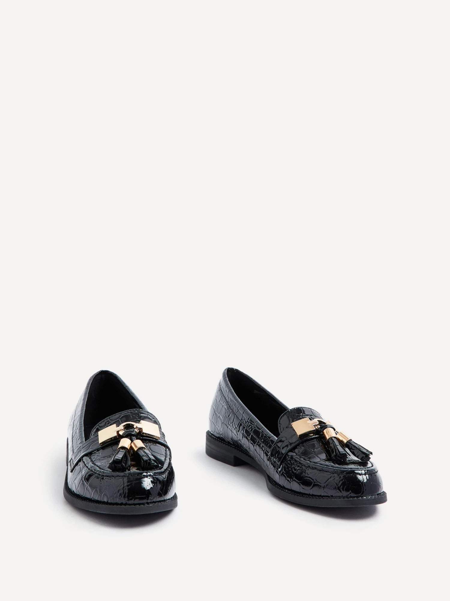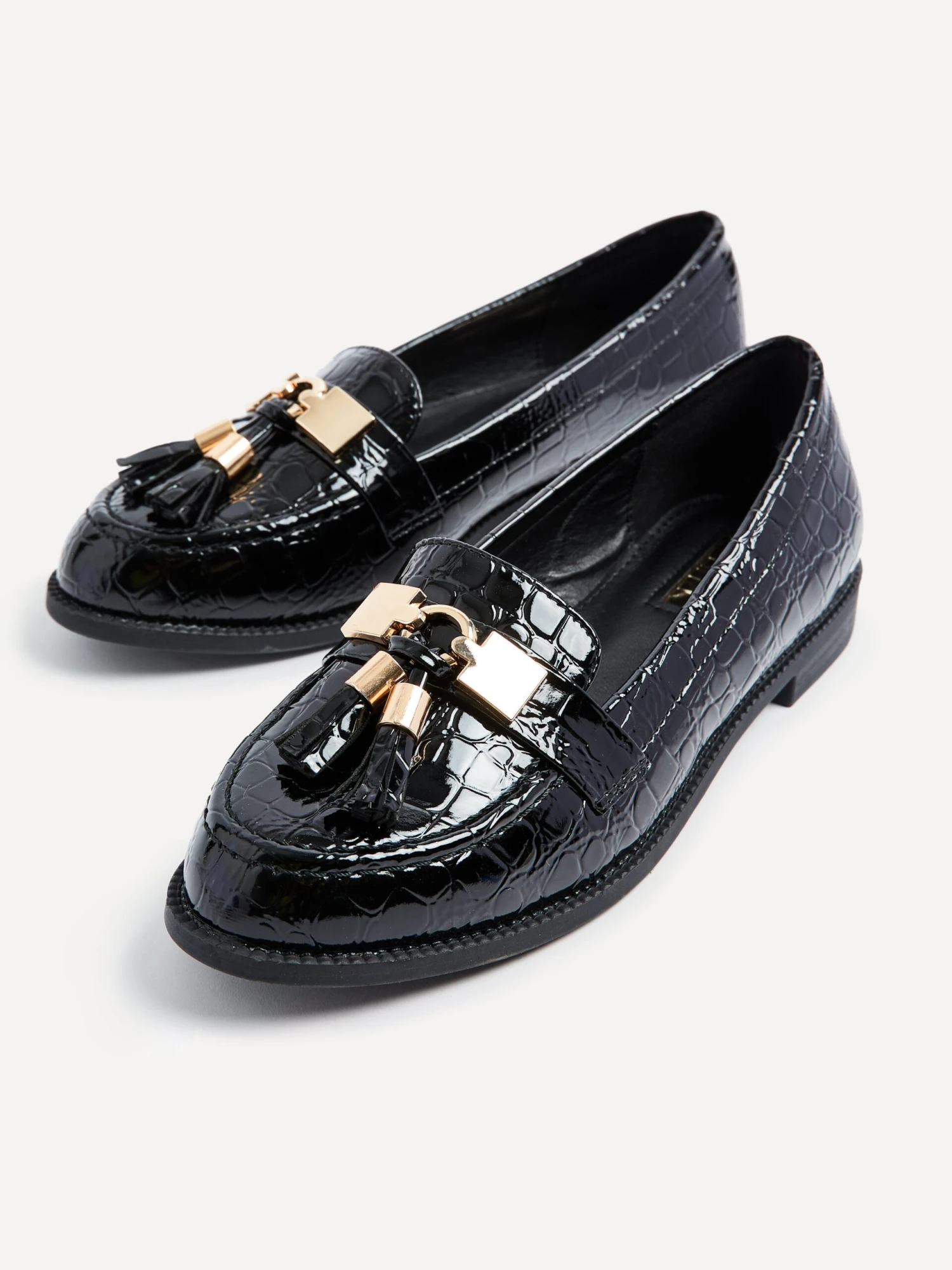 Gleaming Faux Croc Patent Leather accented with Gold Bar & Tassel Detail make this timeless loafer a must-have!