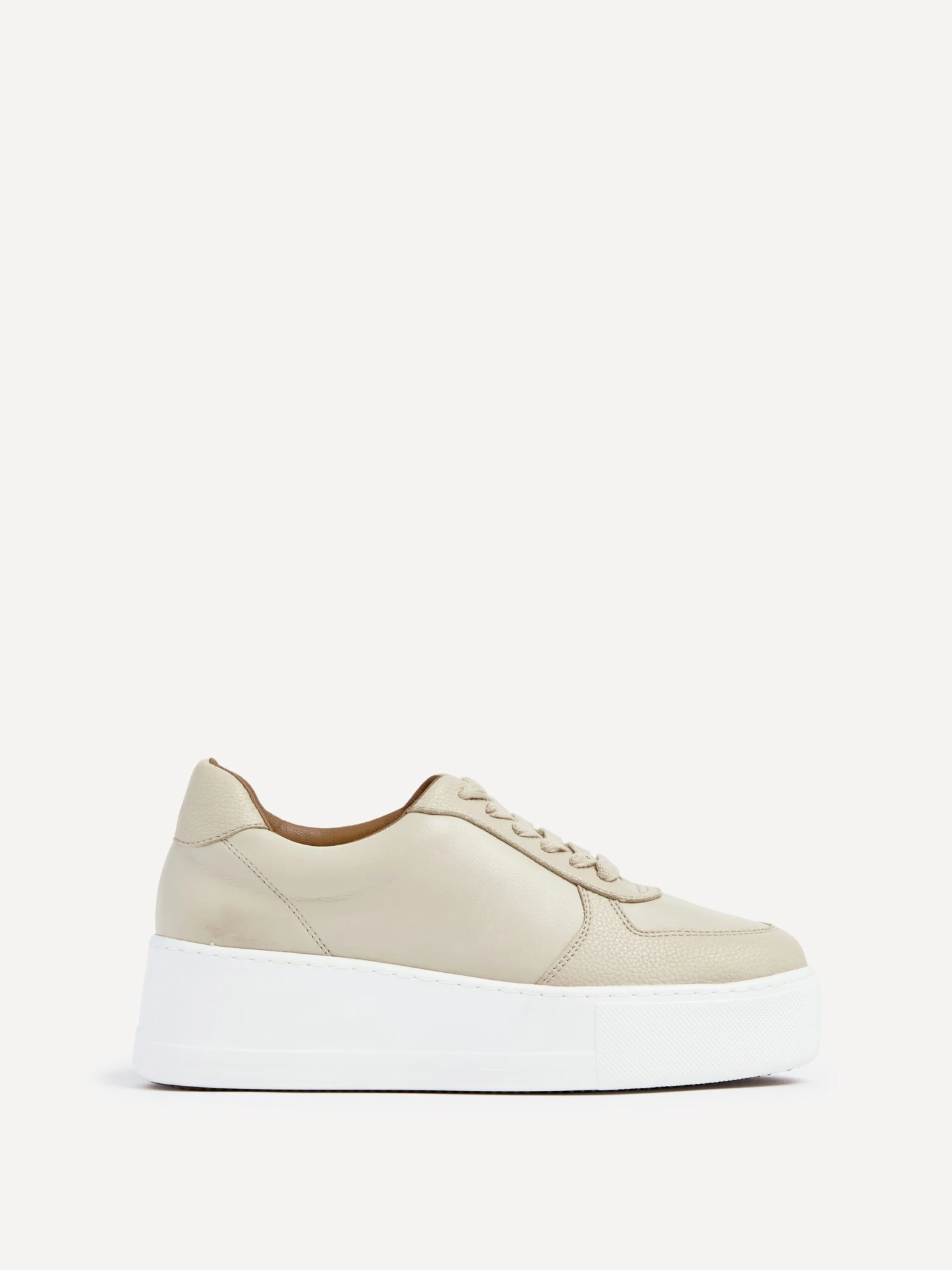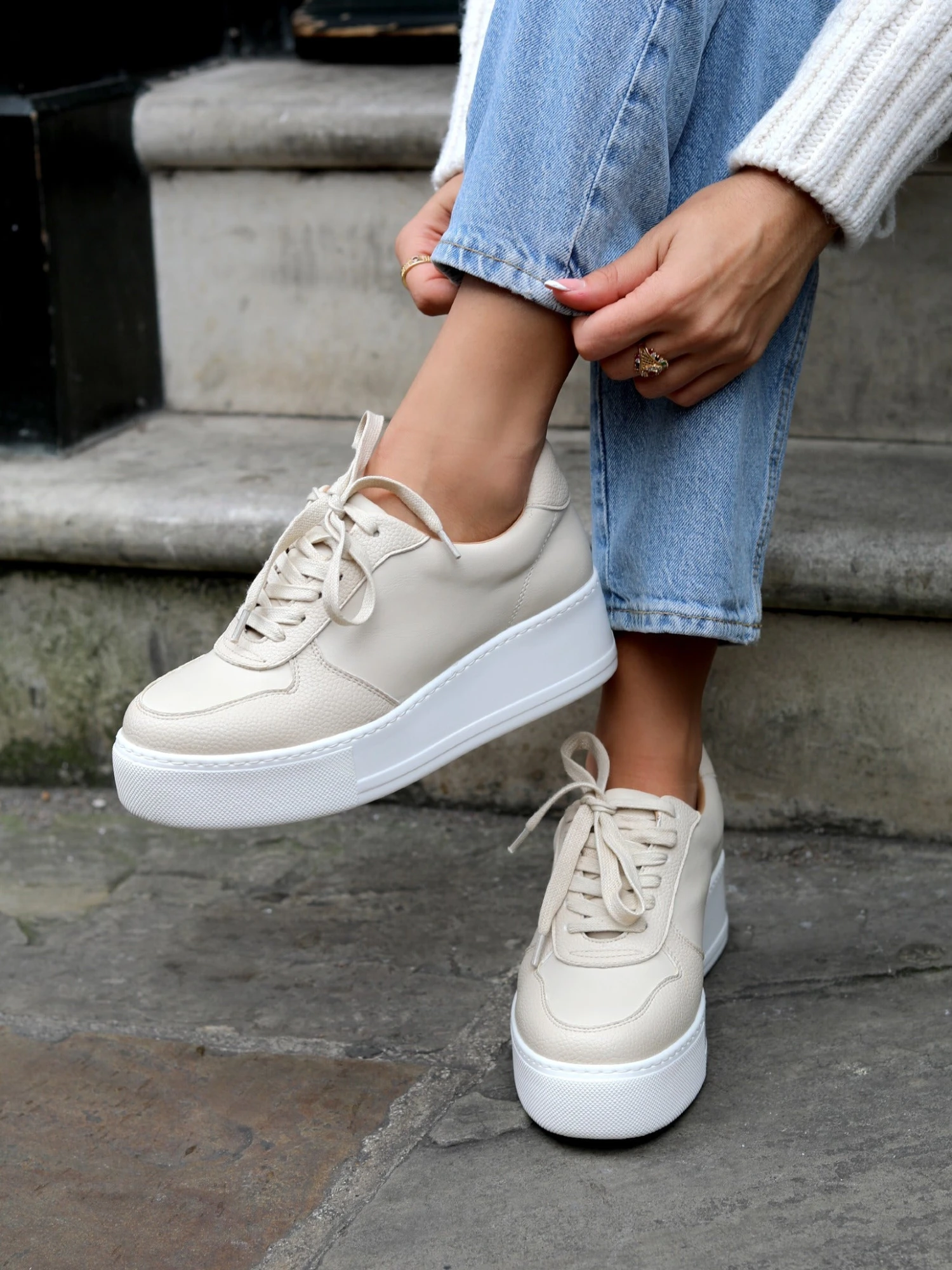 Beige platform soft faux leather lace up trainer with a nude insock. Take your look to a whole new level with this statement-making platform trainer. It’s the perfect way to elevate any outfit, and add an extra pop of style. Make every step count and step out in confidence.