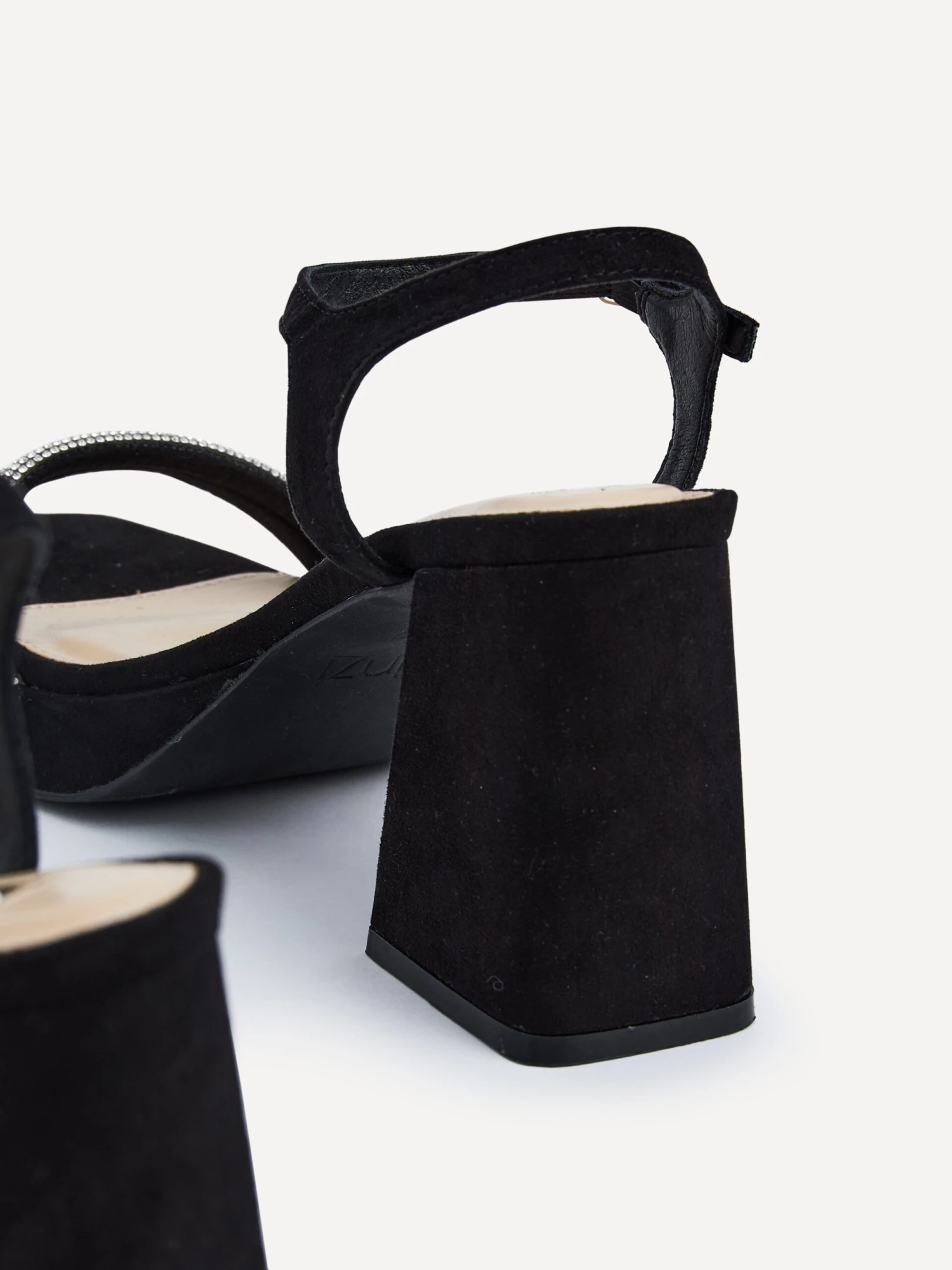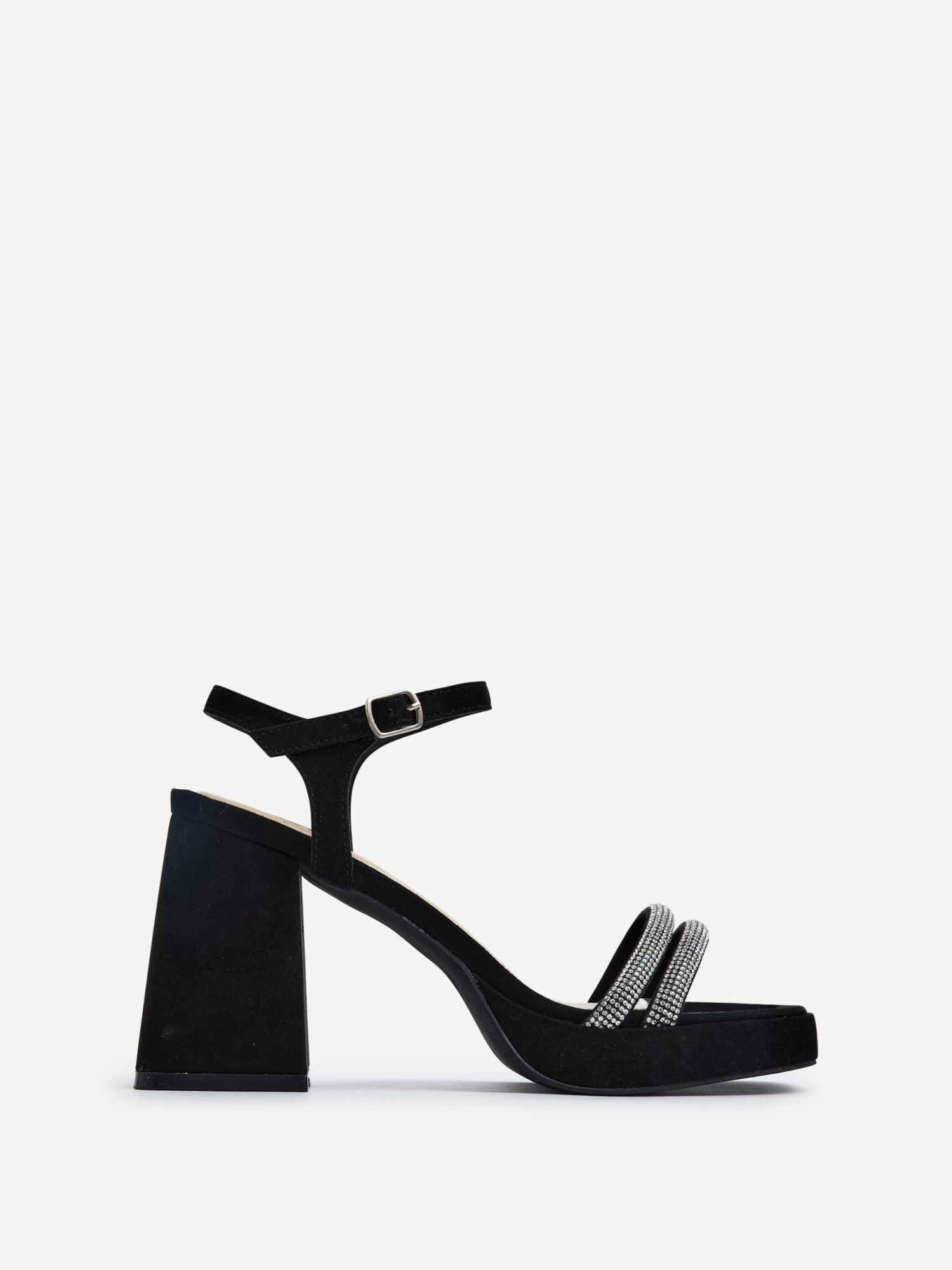 Elevate your look with the Xandra platform heels. Crafted from luxurious faux suede with a sparkling double diamante front strap, these heels make a chic and sophisticated entrance. Offering a platform height of 2cm and a heel height of 10cm.